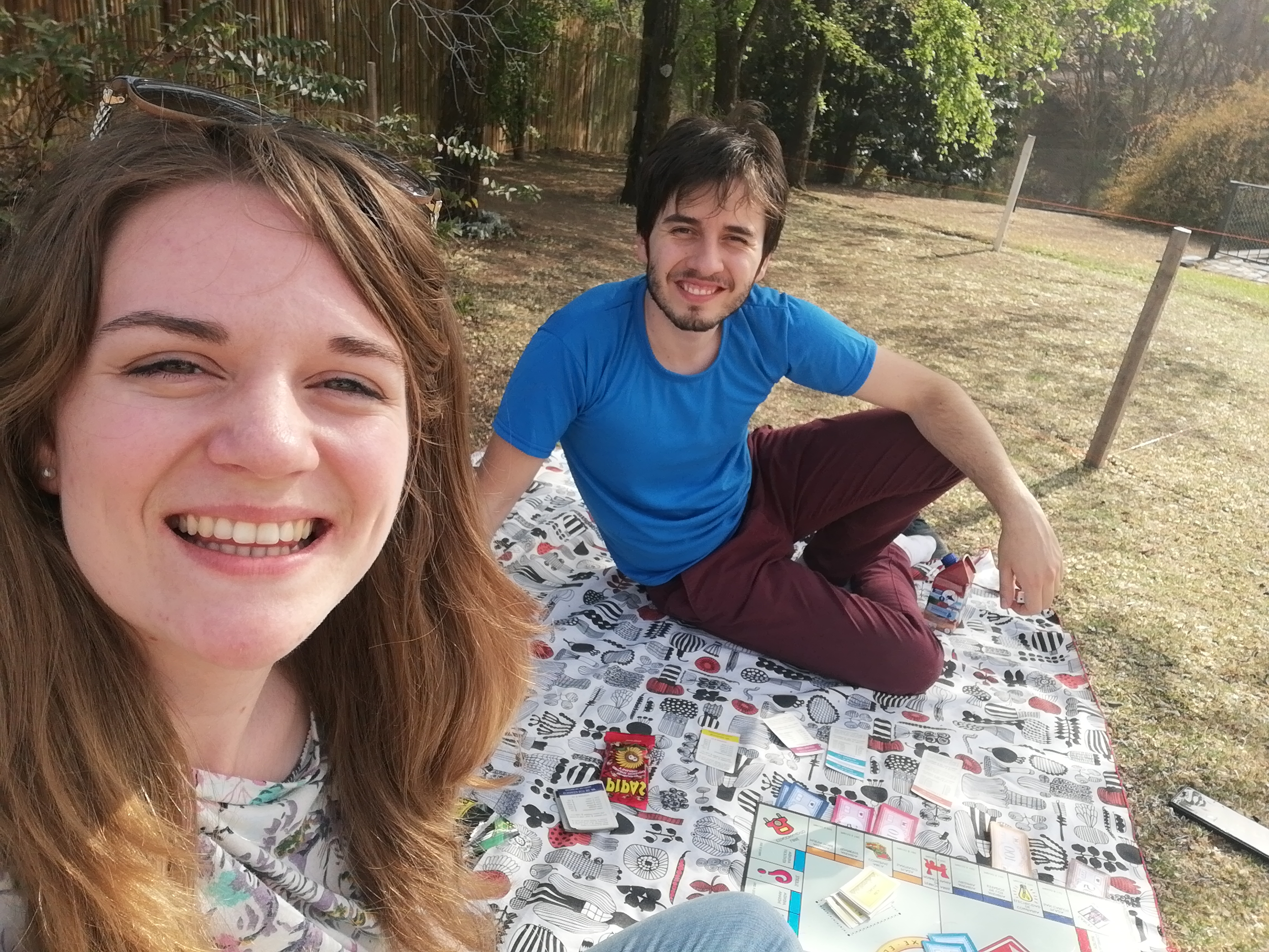 After the arrival of the cheesecake, Nolz and I went off to the local shop to pick up supplies for later. Now I know I said I couldn’t go out to buy a present for Nolz, but this shop we could get to and was open because it’s a food shop which is the only place to buy things for Noly’s neighbourhood. So anyways, off Nolz went to pick up some supplies. After that we went out for a walk and had some lunch. In the afternoon we went out with our picnic supplies to play a spot of monopoly. However, we weren’t alone. Lola, Noly’s dog, decided that, in fact, this afternoon was to be all about her! And positioned herself right in the middle of the picnic blanket, with her head on the monopoly board for good measure! She seemed incredibly pleased with herself and lay there, wag wag wagging her tail almost constantly. With a little coaxing she did eventually move over a little and allowed us to play haha.