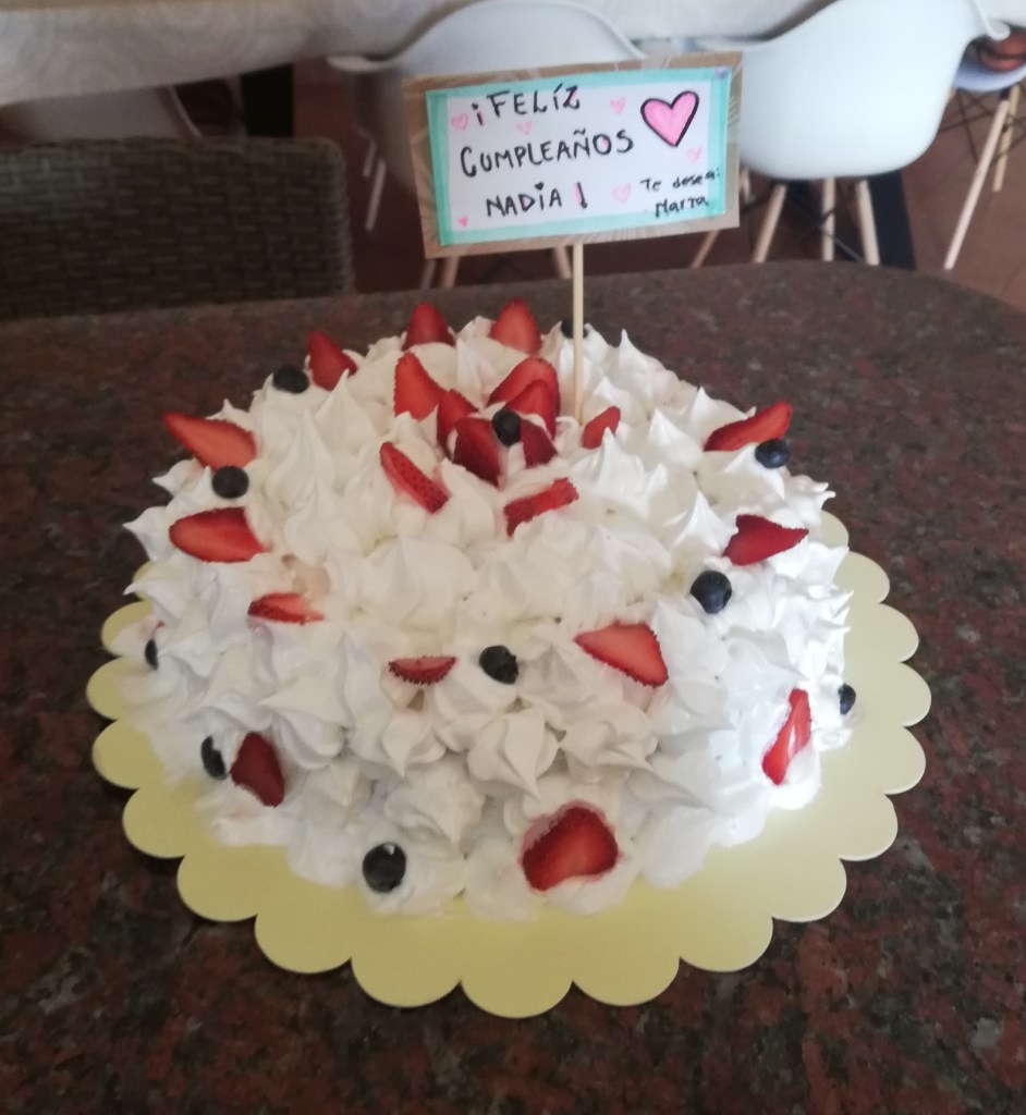 After breakfast we just chilled for a bit before heading out to San Lorenzo to pick up the Empanadas. Was v pleased we were tasked to pick them up as that gave us an excuse to go out. On the way back we stopped by the entrance to Nolys neighbourhood as Marta, Nolys gran, had kindly had cake delivered there! The cake was a beauty. It was interesting driving back with it as it was v creamy and with no box around it so was worried, what with Nolys driving (😉) and the speed bumps I’d get cake to the face! But thankfully we made it to the house with no incident.